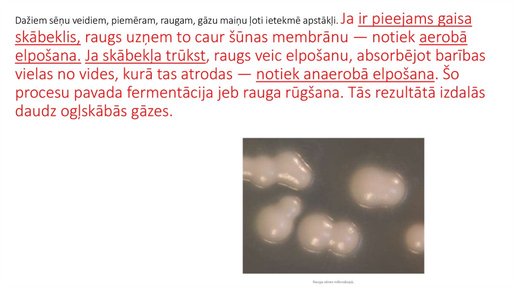 šūnas membrānu — notiek aerobāelpošana. Ja skābekļa trūkst, raugs veic elpošanu, absorbējot barības