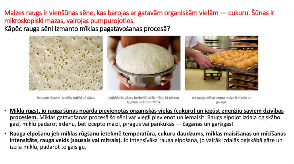 • Mīkla rūgst, jo rauga šūnas noārda pievienotās organiskās vielas (cukuru) un iegūst enerģiju saviem dzīvības