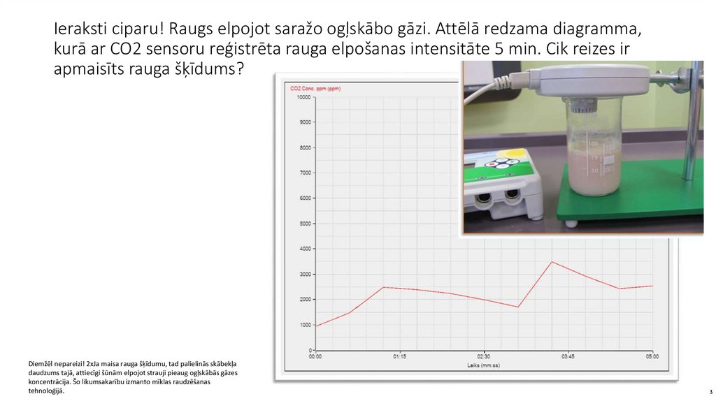 14. Ieraksti ciparu! Raugs elpojot saražo ogļskābo gāzi. Attēlā redzama diagramma, kurā ar CO2 sensoru reģistrēta rauga elpošanas