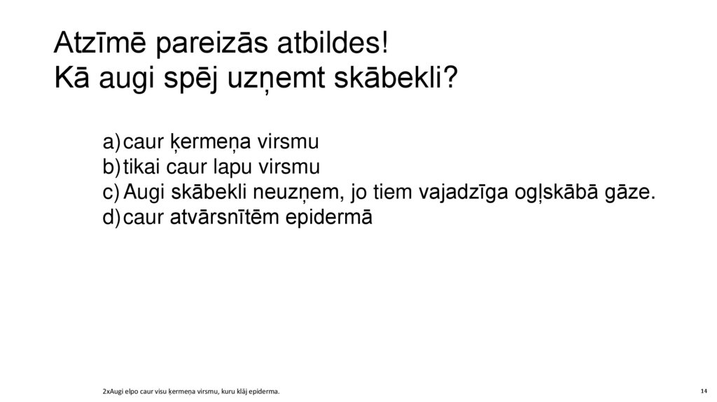 c) Augi skābekli neuzņem, jo tiem vajadzīga ogļskābā gāze.