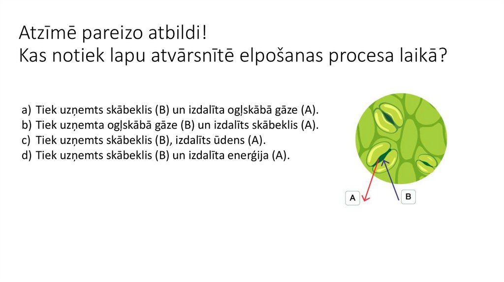 a) Tiek uzņemts skābeklis (B) un izdalīta ogļskābā gāze (A).b) Tiek uzņemta ogļskābā gāze (B) un izdalīts skābeklis (A).