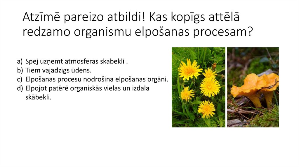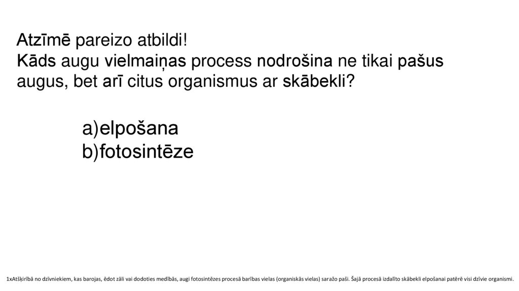 17. Atzīmē pareizo atbildi! Kāds augu vielmaiņas process nodrošina ne tikai pašus augus, bet arī citus organismus ar skābekli?