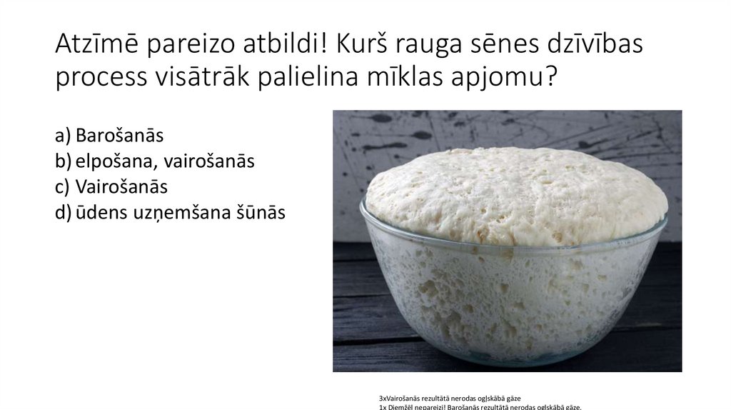 20. Atzīmē pareizo atbildi! Kurš rauga sēnes dzīvības process visātrāk palielina mīklas apjomu?