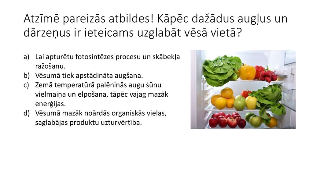 21. Atzīmē pareizās atbildes! Kāpēc dažādus augļus un dārzeņus ir ieteicams uzglabāt vēsā vietā?