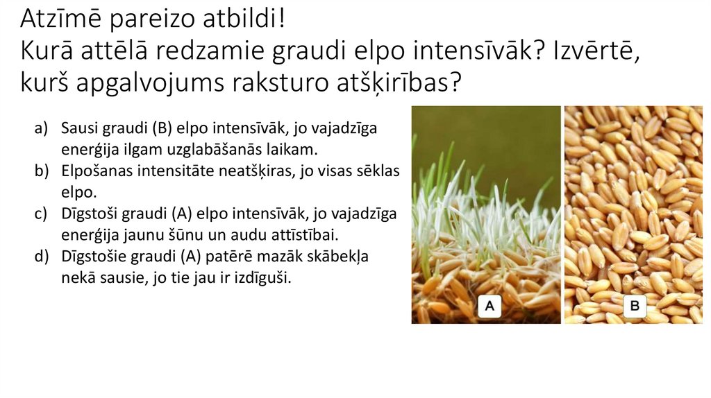 a) Sausi graudi (B) elpo intensīvāk, jo vajadzīgaenerģija ilgam uzglabāšanās laikam.