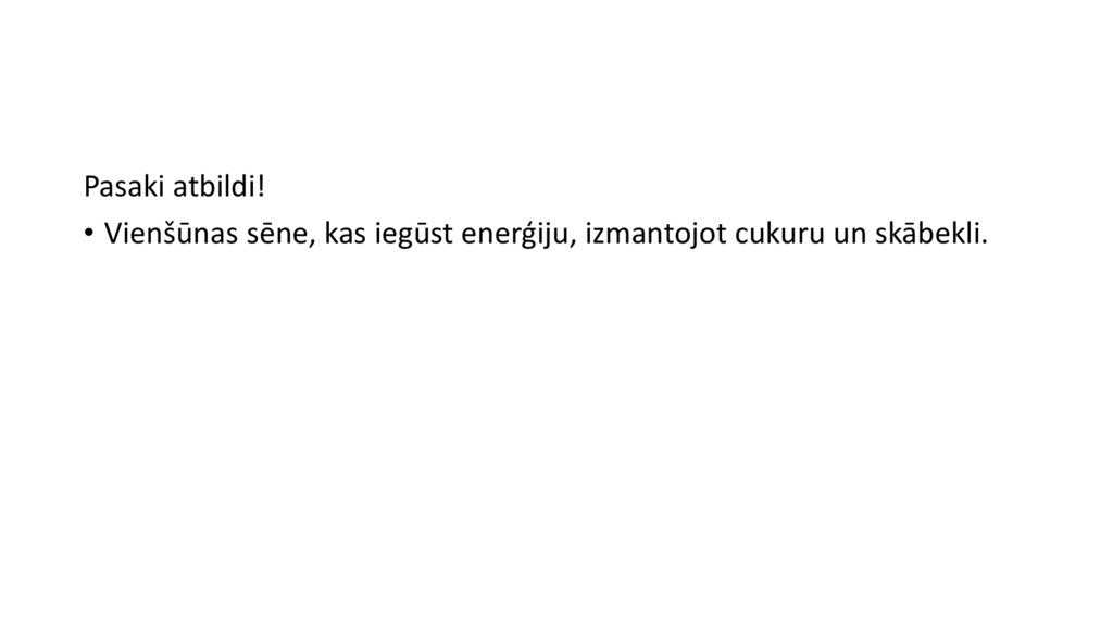 Pasaki atbildi!• Vienšūnas sēne, kas iegūst enerģiju, izmantojot cukuru un skābekli.