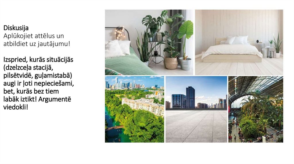 6. Diskusija Aplūkojiet attēlus un atbildiet uz jautājumu! Izspried, kurās situācijās (dzelzceļa stacijā, pilsētvidē, guļamistabā)