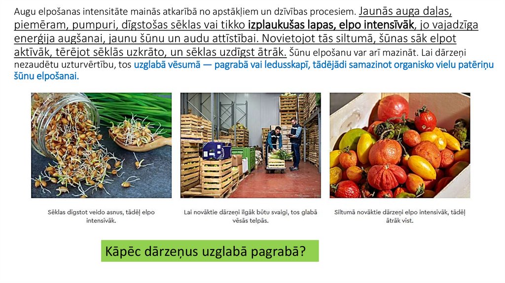 aktīvāk, tērējot sēklās uzkrāto, un sēklas uzdīgst ātrāk. Šūnu elpošanu var arī mazināt. Lai dārzeņi