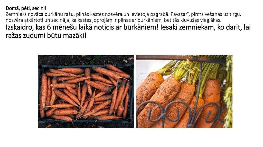8. Domā, pēti, secini! Zemnieks novāca burkānu ražu, pilnās kastes nosvēra un ievietoja pagrabā. Pavasarī, pirms vešanas uz tirgu,