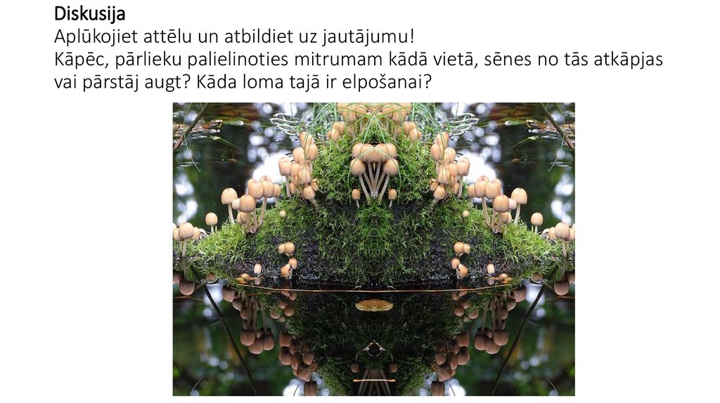 10. Diskusija Aplūkojiet attēlu un atbildiet uz jautājumu! Kāpēc, pārlieku palielinoties mitrumam kādā vietā, sēnes no tās atkāpjas
