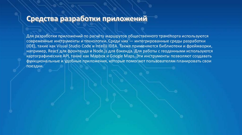 Средства разработки приложенийДля разработки приложений по расчёту маршрутов общественного транспорта используются