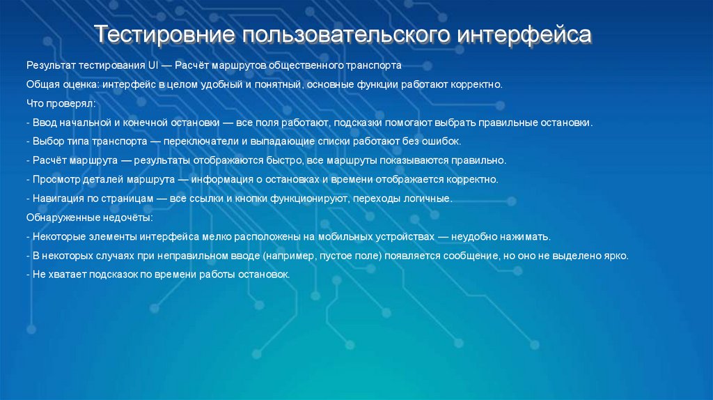 Тестировние пользовательского интерфейсаРезультат тестирования UI — Расчёт маршрутов общественного транспорта