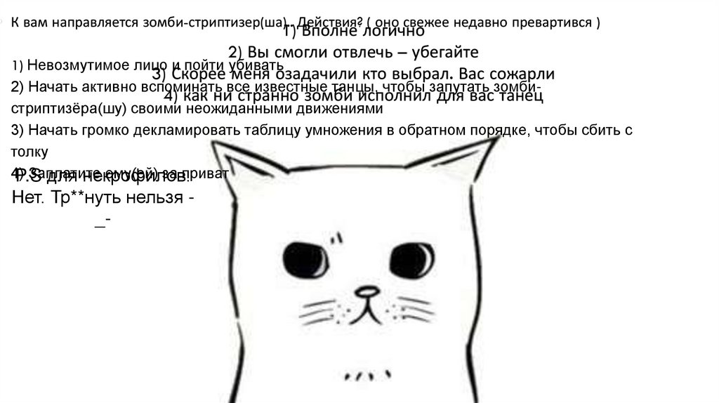 • К вам направляется зомби-стриптизер(ша).. Действия? ( оно свежее недавно превартився )1) Вполне логично