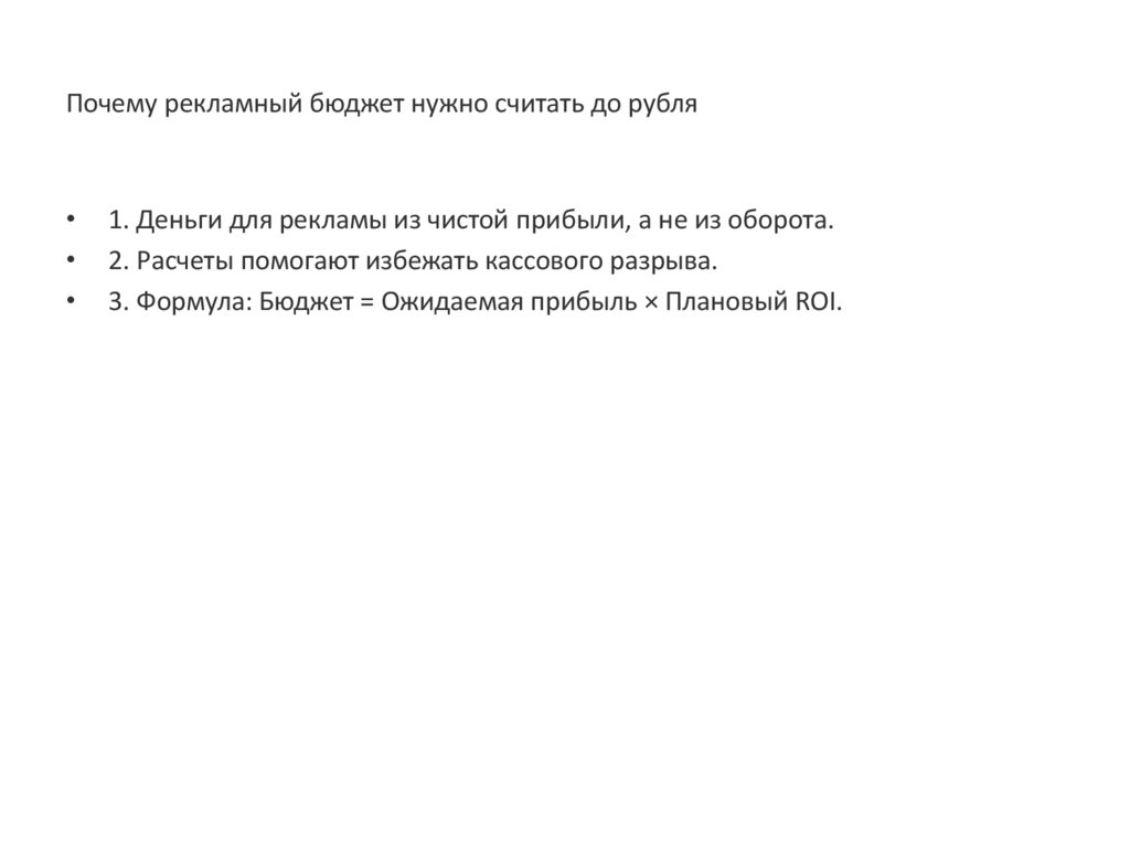 3. Формула: Бюджет = Ожидаемая прибыль × Плановый ROI.