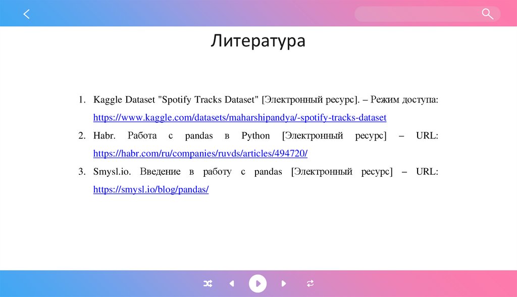 Литература1. Kaggle Dataset "Spotify Tracks Dataset" [Электронный ресурс]. – Режим доступа: