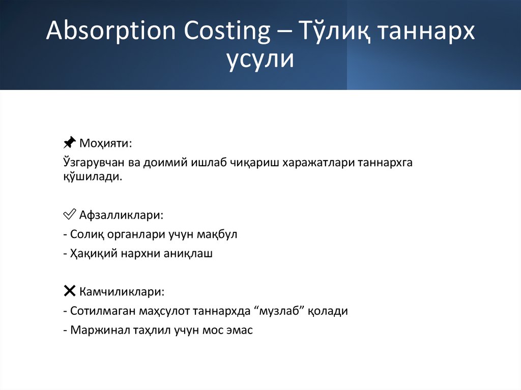 4. Тўлиқ таннарх усули (Absorption Costing)
