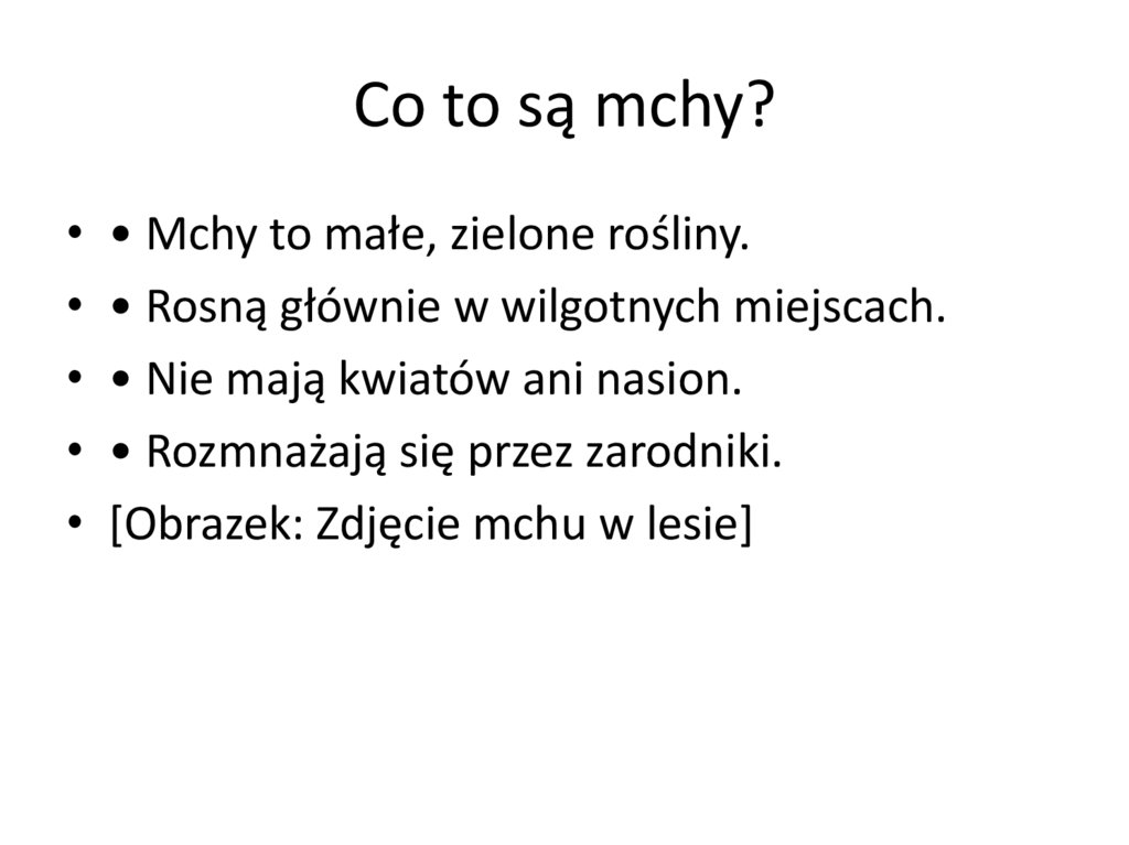 Co to są mchy?• • Mchy to małe, zielone rośliny.