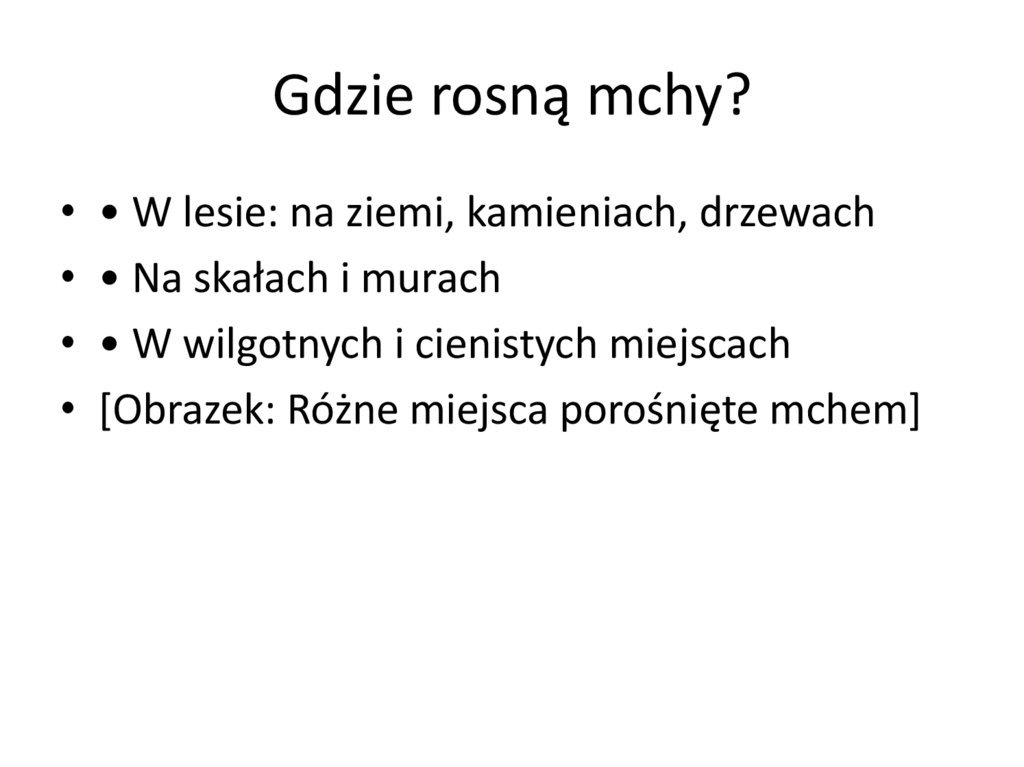 Gdzie rosną mchy?• • W lesie: na ziemi, kamieniach, drzewach