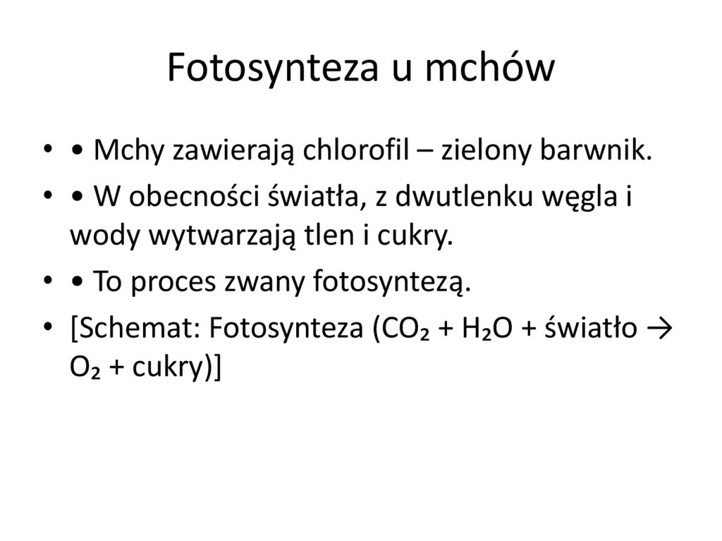 Fotosynteza u mchów• • Mchy zawierają chlorofil – zielony barwnik.