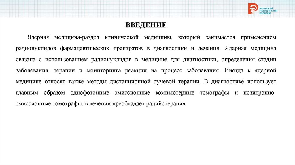 ВВЕДЕНИЕЯдерная медицина-раздел клинической медицины, который занимается применением