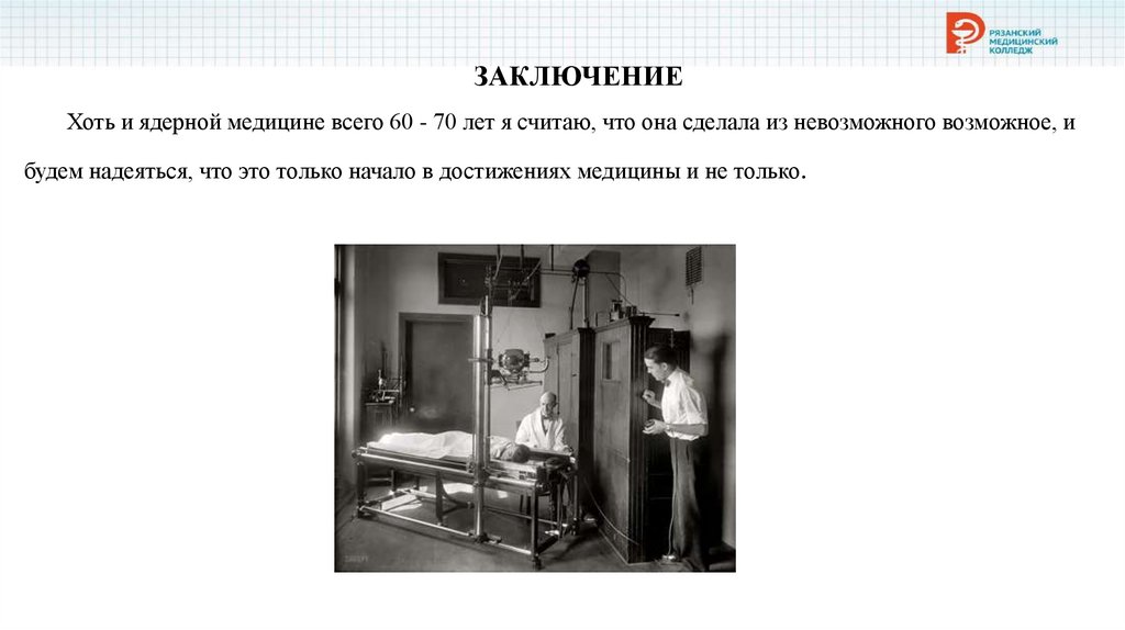 ЗАКЛЮЧЕНИЕХоть и ядерной медицине всего 60 - 70 лет я считаю, что она сделала из невозможного возможное, и