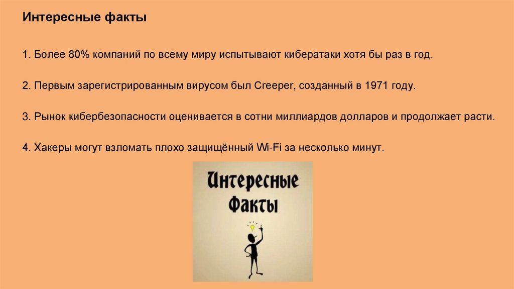 Интересные факты1. Более 80% компаний по всему миру испытывают кибератаки хотя бы раз в год.