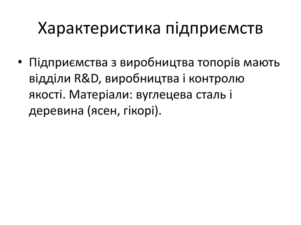 Характеристика підприємств• Підприємства з виробництва топорів мають