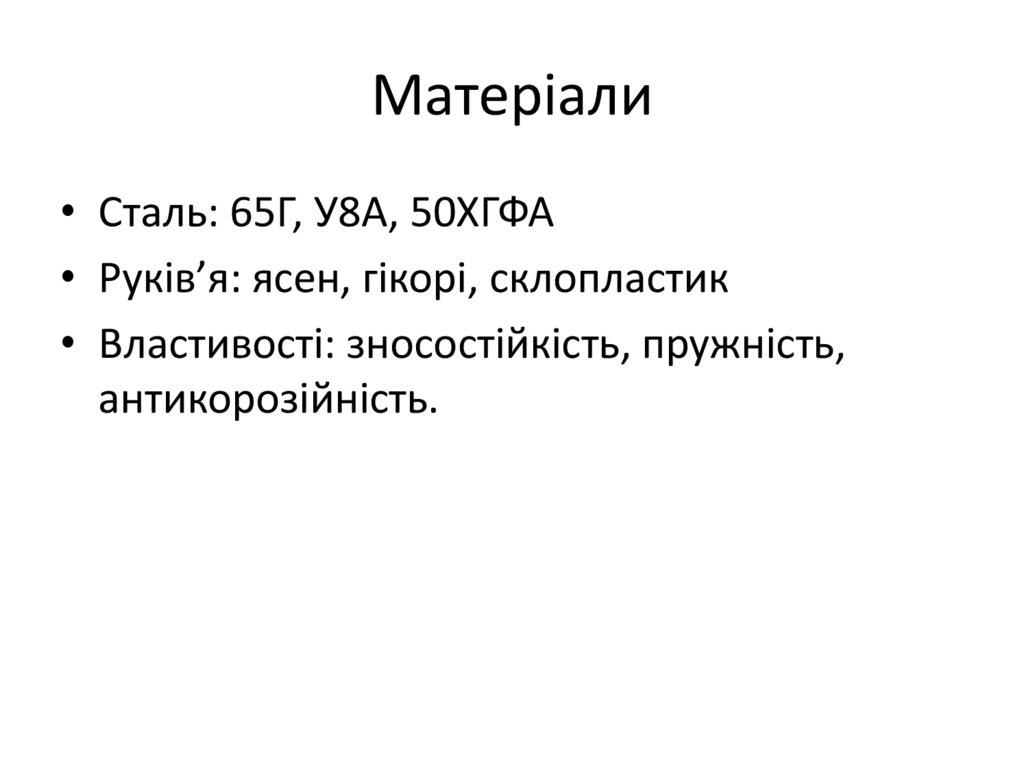 Матеріали• Сталь: 65Г, У8А, 50ХГФА