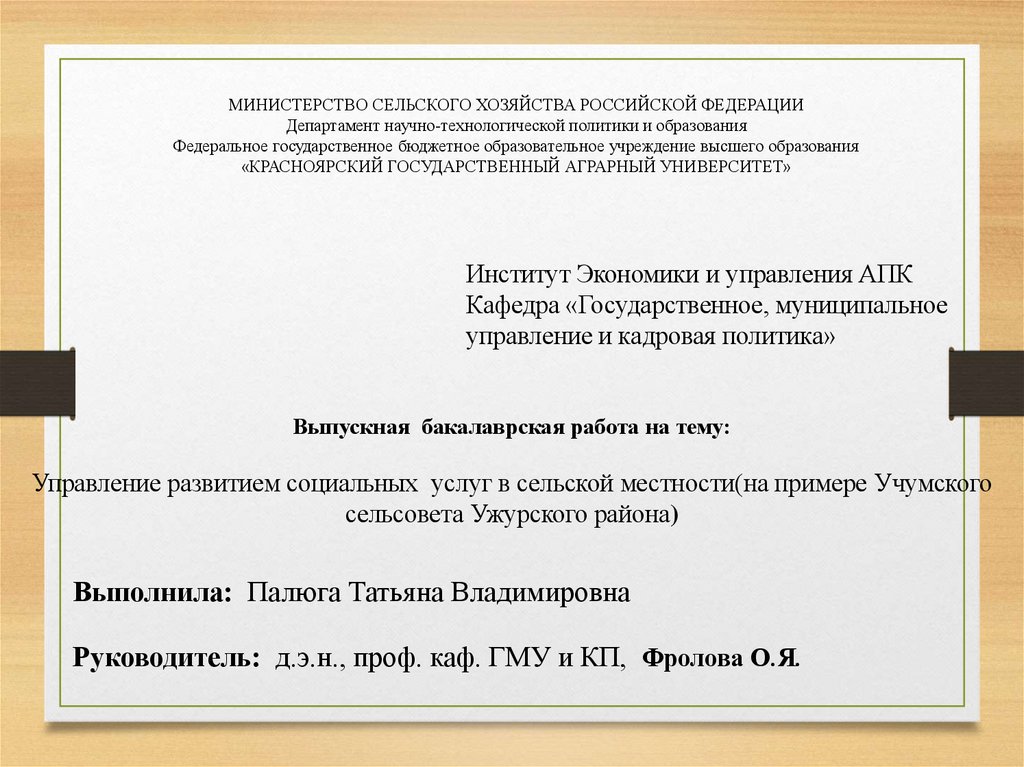Руководитель: д.э.н., проф. каф. ГМУ и КП, Фролова О.Я.