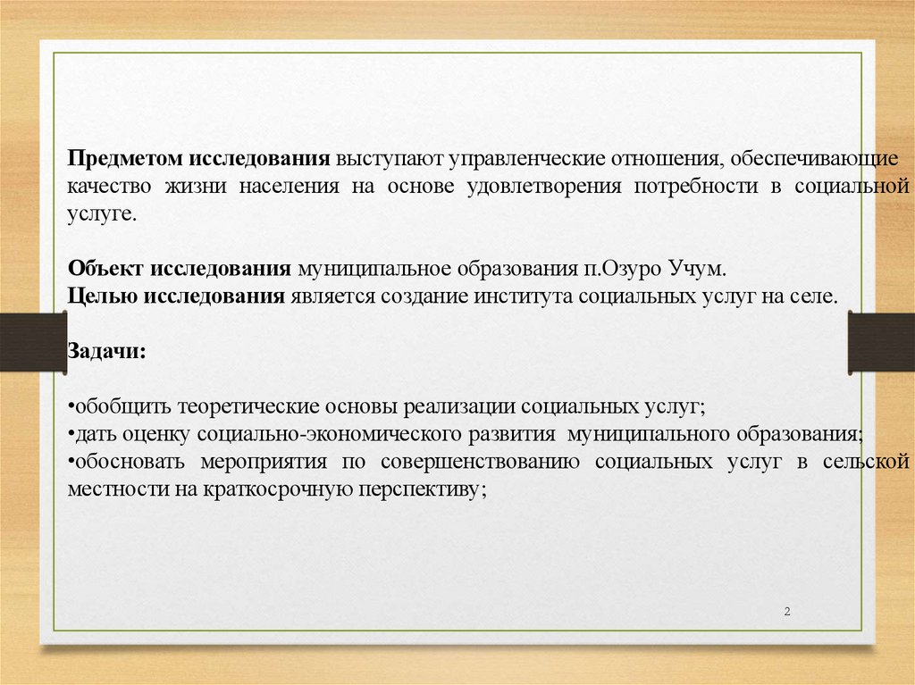 Предметом исследования выступают управленческие отношения, обеспечивающиекачество жизни населения на основе удовлетворения потребности в социальной