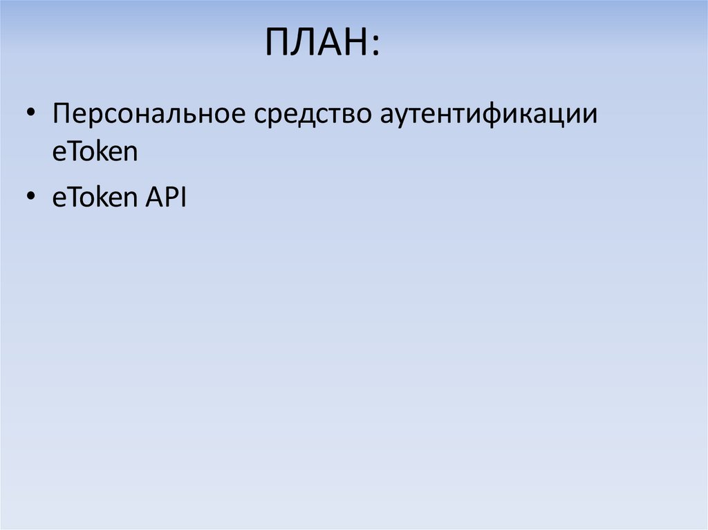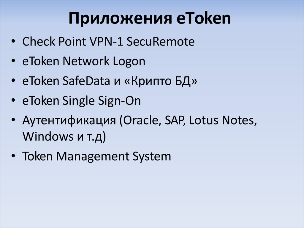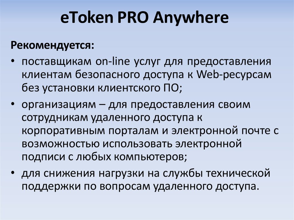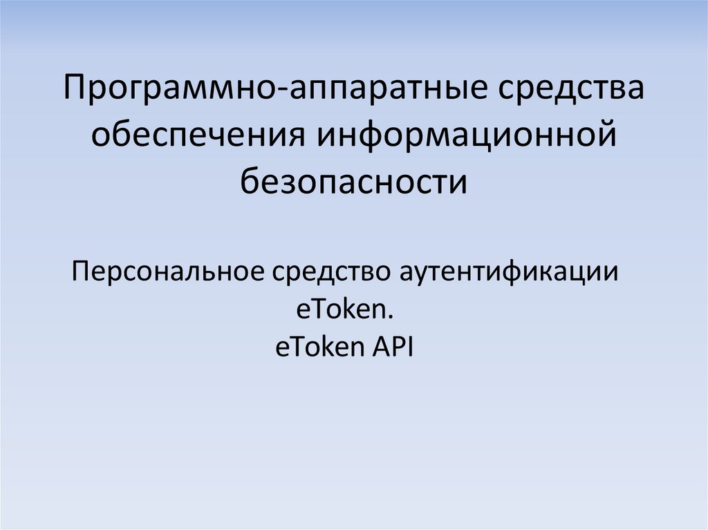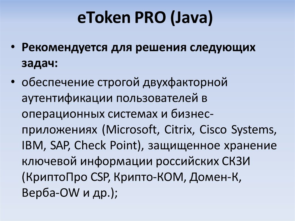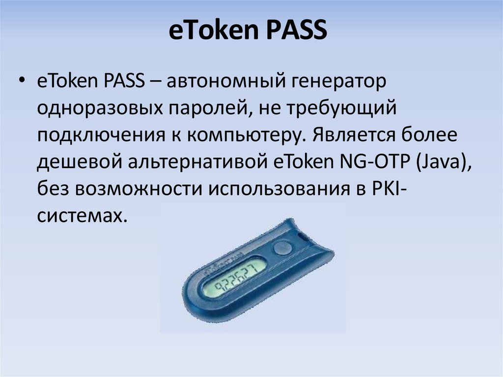 • Сертифицированные электронные ключи eToken являютсяпрограммно-аппаратным средством аутентификации и