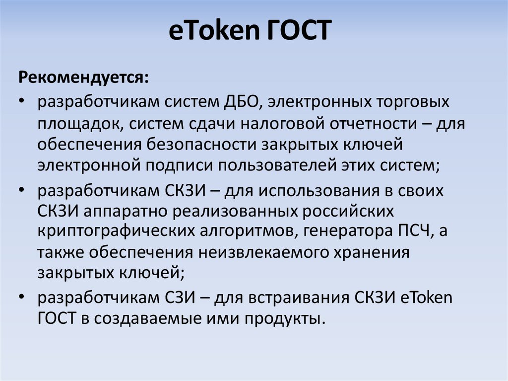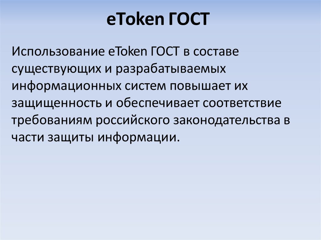 • Электронный ключ eToken ГОСТ соответствует требованиями