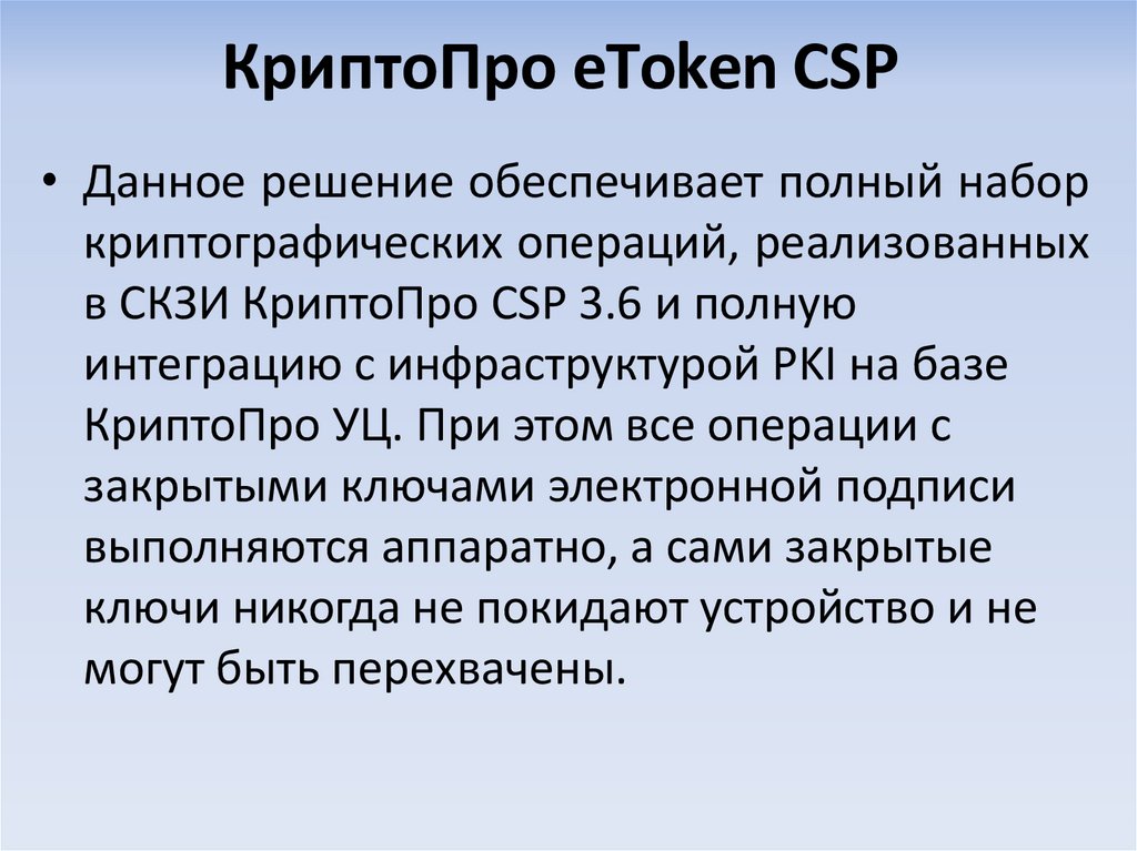 • КриптоПро eToken CSP – аппаратнопрограммное средство формированияквалифицированной электронной подписи с