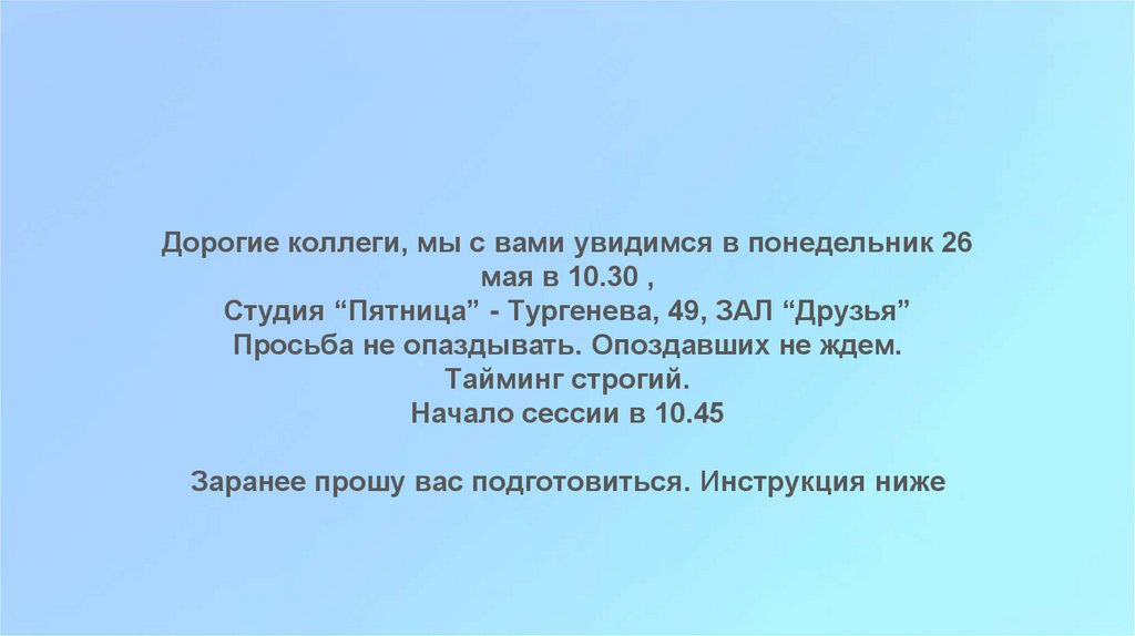 Дорогие коллеги, мы с вами увидимся в понедельник 26мая в 10.30 ,