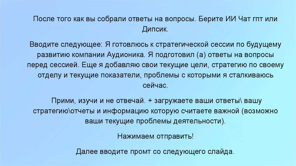 После того как вы собрали ответы на вопросы. Берите ИИ Чат гпт илиДипсик.
