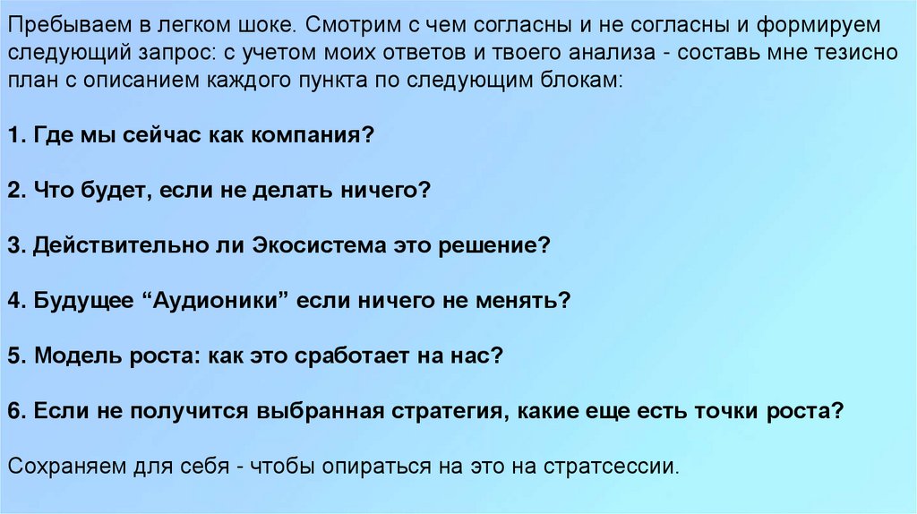 Пребываем в легком шоке. Смотрим с чем согласны и не согласны и формируемследующий запрос: с учетом моих ответов и твоего анализа - составь мне тезисно