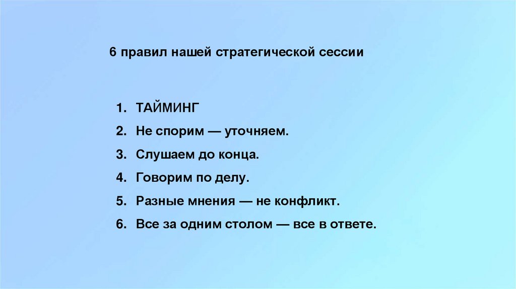 6 правил нашей стратегической сессии1. ТАЙМИНГ