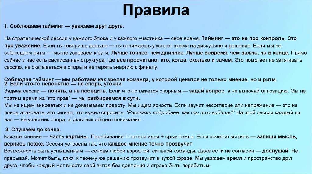 Правила1. Соблюдаем тайминг — уважаем друг друга.