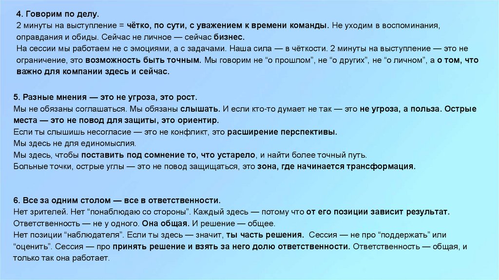 На сессии мы работаем не с эмоциями, а с задачами. Наша сила — в чёткости. 2 минуты на выступление — это не