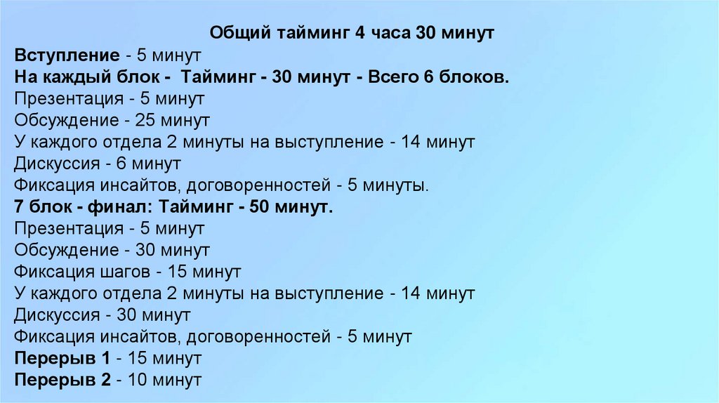 На каждый блок - Тайминг - 30 минут - Всего 6 блоков.