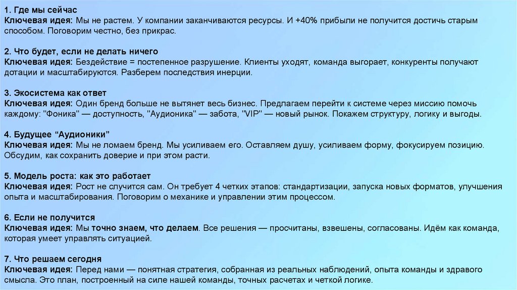 Ключевая идея: Перед нами — понятная стратегия, собранная из реальных наблюдений, опыта команды и здравого