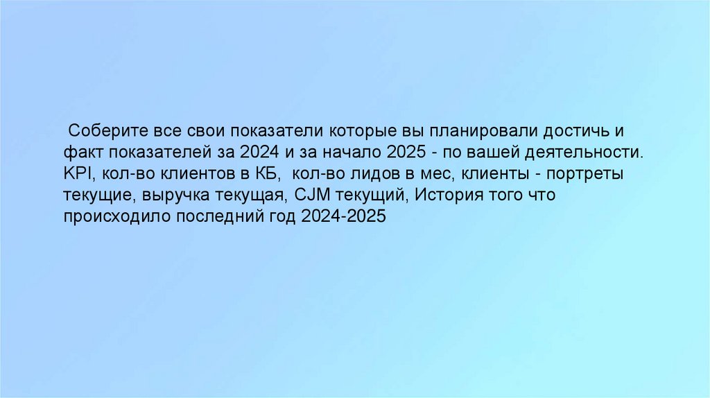 Соберите все свои показатели которые вы планировали достичь ифакт показателей за 2024 и за начало 2025 - по вашей деятельности.