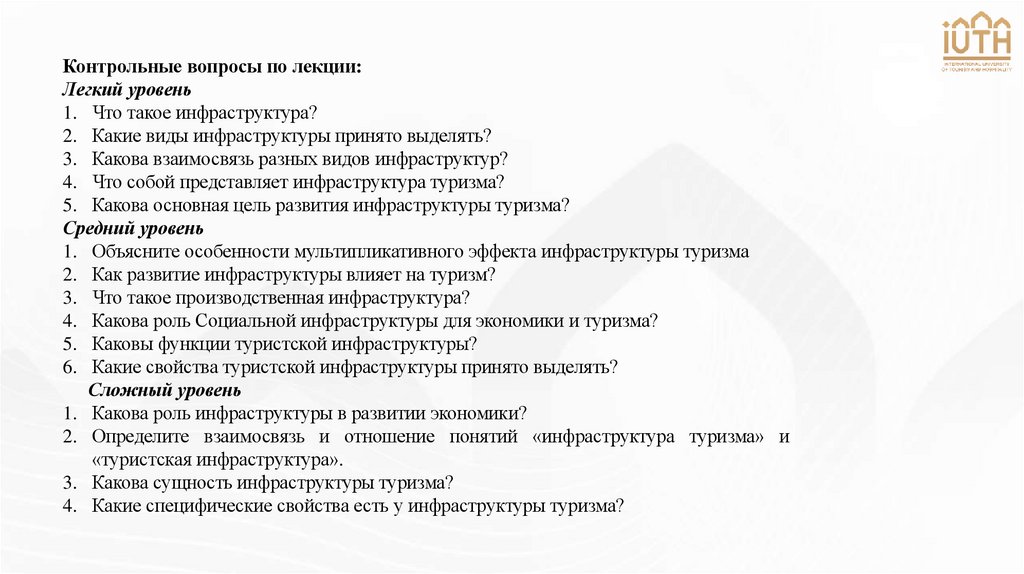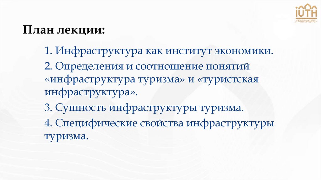 1. «Инфраструктура туризма» ЛЕКЦИЯ № 1 ТЕМА ЛЕКЦИИ: «Инфраструктура туризма: понятие и сущность»