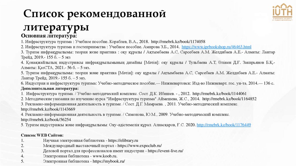 2. Методические указания по изучению курса "Инфраструктура туризма" Аймешева, Ж.С., 2014. http://rmebrk.kz/book/1164852