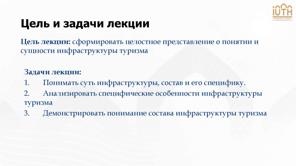 Цель лекции: сформировать целостное представление о понятии исущности инфраструктуры туризма