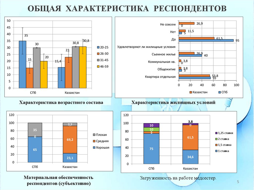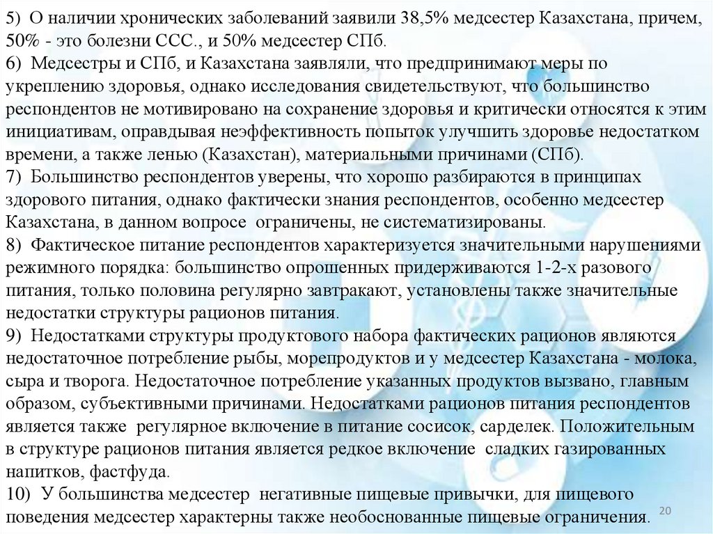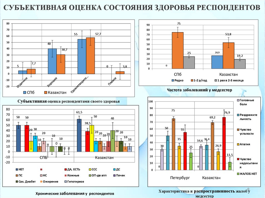 5) О наличии хронических заболеваний заявили 38,5% медсестер Казахстана, причем,50% - это болезни ССС., и 50% медсестер СПб.