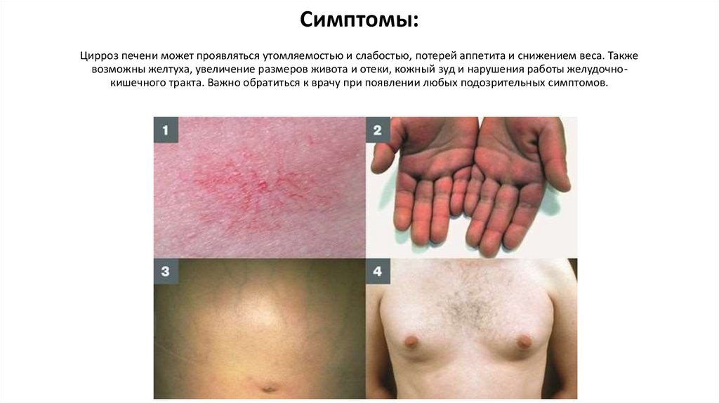 Симптомы:Цирроз печени может проявляться утомляемостью и слабостью, потерей аппетита и снижением веса. Также
