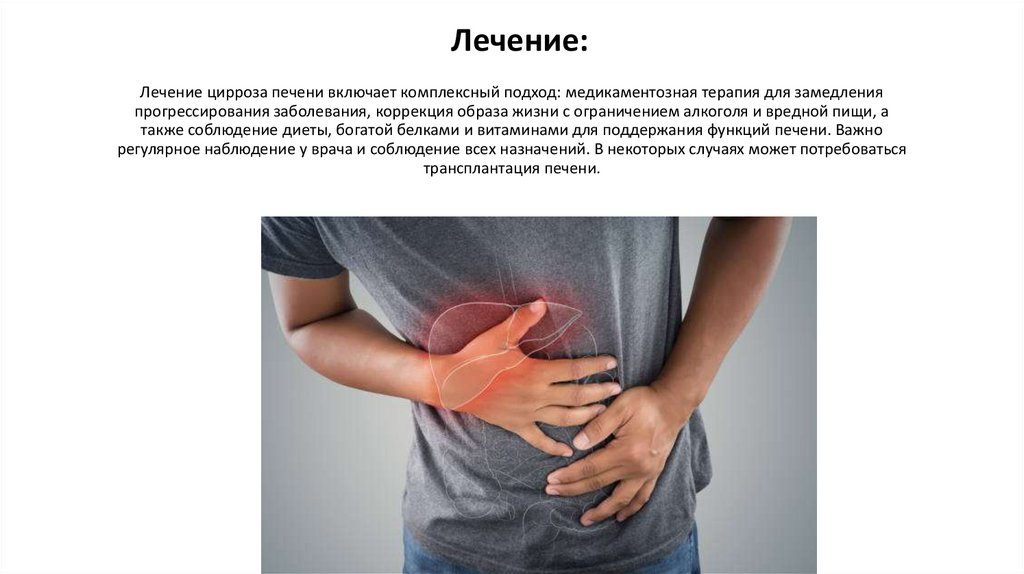 Лечение:Лечение цирроза печени включает комплексный подход: медикаментозная терапия для замедления