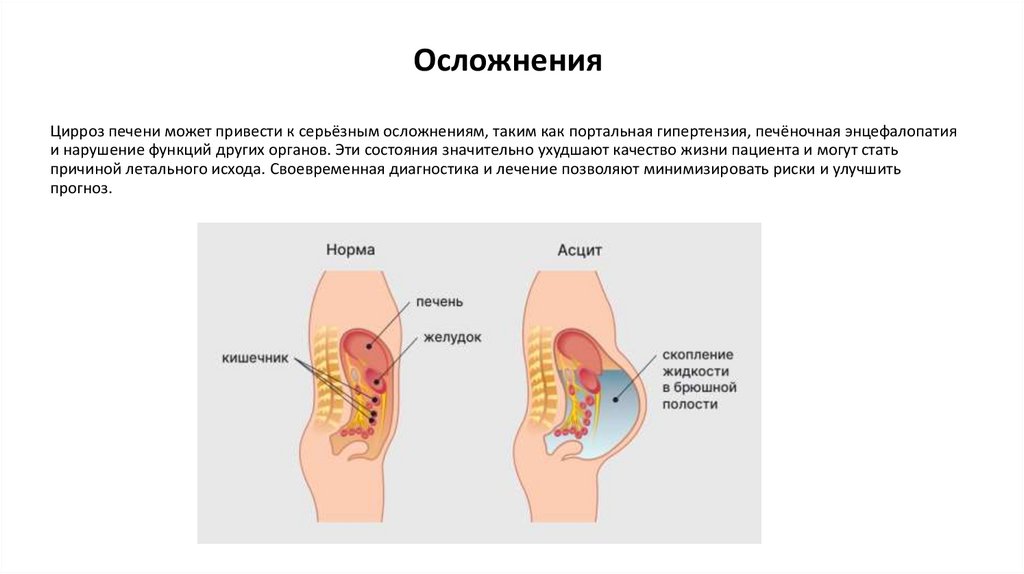 ОсложненияЦирроз печени может привести к серьёзным осложнениям, таким как портальная гипертензия, печёночная энцефалопатия