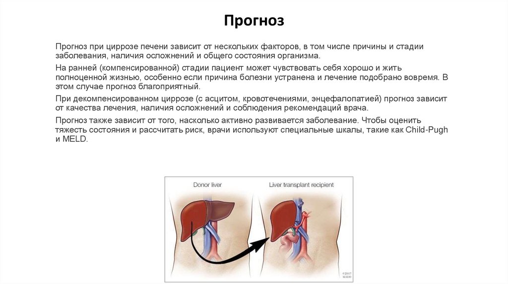 ПрогнозПрогноз при циррозе печени зависит от нескольких факторов, в том числе причины и стадии